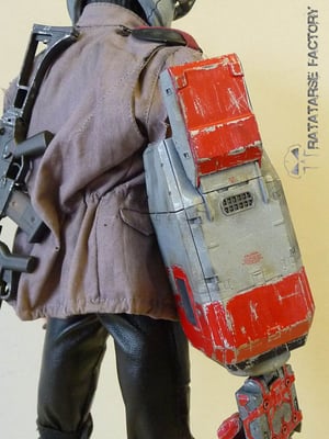 A docking station for the helmet is on the right shoulder, the gun holster is home-made, the belt and its buckle are from a WWII German grenadier...